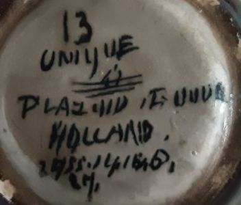 These experimental vases were made around 1930, the numbers next to the mark under the vases are codes for the paint and/or glazes used. Herman Verlee (who was in charge of the laboratory) provided the paint and glaze. Willem Muller was the dedicated painter. Because the work was rather specialised I do not think any other people became involved.